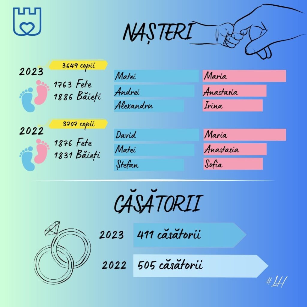 „Deschidem lista informărilor din anul 2024 cu vești optimiste. În anul ce tocmai a trecut, 3649 de copii s-au născut în municipiul Suceava, respectiv 1763 fete și 1886 băieți. Totodată, s-au întemeiat și 411 familii, printr-un DA hotărât spus în fața ofițerului de stare civilă. Dintre acestea, 95 au fost oficiate de către mine, fiind martor al bucuriei și al emoției lor. Cel mai des întâlnite prenume au fost: Maria (53), Anastasia (38), Irina (33); Matei (34), Andrei (33), Alexandru (28)”, a transmis Lucian Harșovschi.