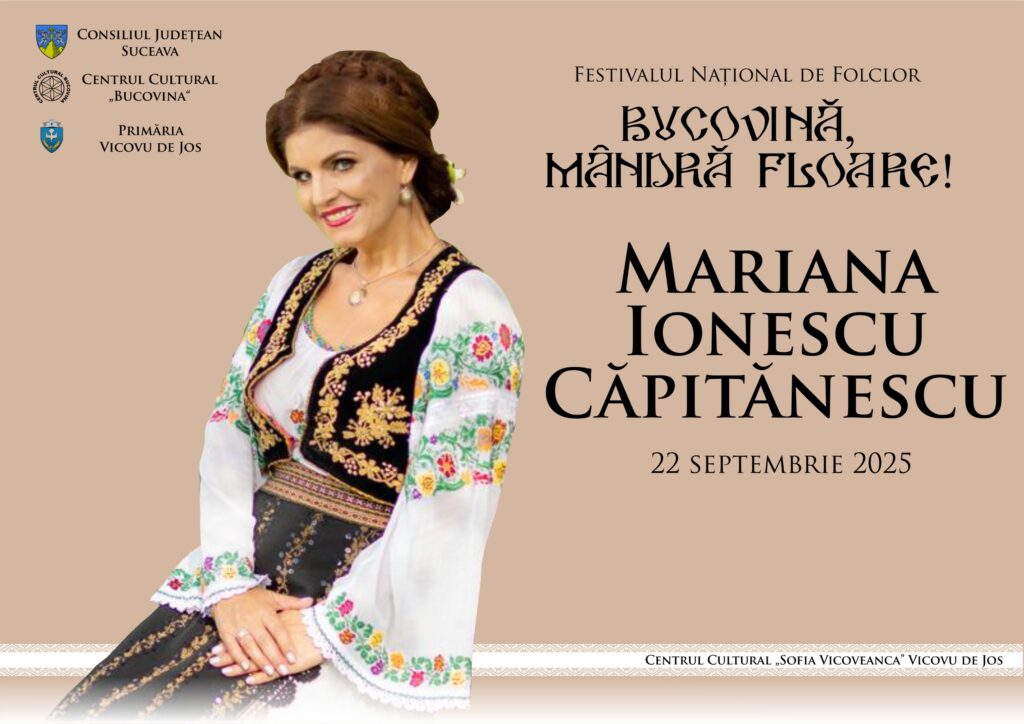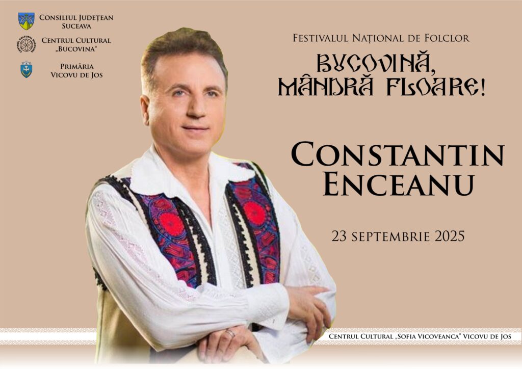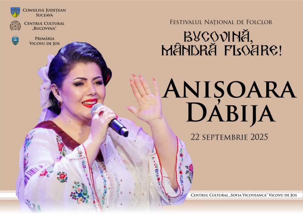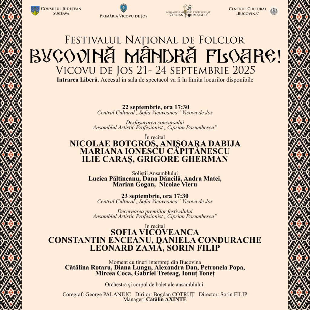 În perioada 21–23 septembrie 2025, la Centrul Cultural „Sofia Vicoveanca” din Vicovu de Jos va avea loc prima ediție a Festivalului Național de Folclor „Bucovina, Mândră Floare!”, un proiect cultural de anvergură, organizat de Consiliul Județean Suceava, prin Centrul Cultural „Bucovina”, în parteneriat cu Primăria comunei Vicovu de Jos.