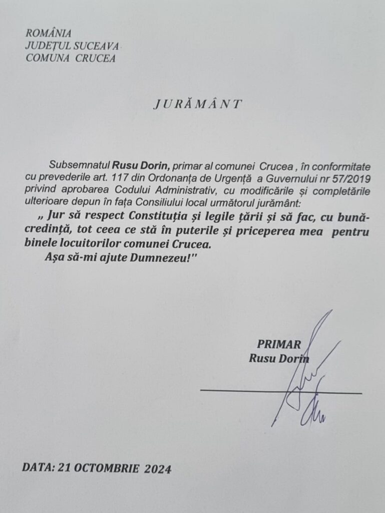 Astăzi, Dorin Rusu, primarul comunei Crucea, a fost învestit pentru cel de-al 5-lea mandat, demonstrând astfel încrederea și susținerea constantă din partea comunității.