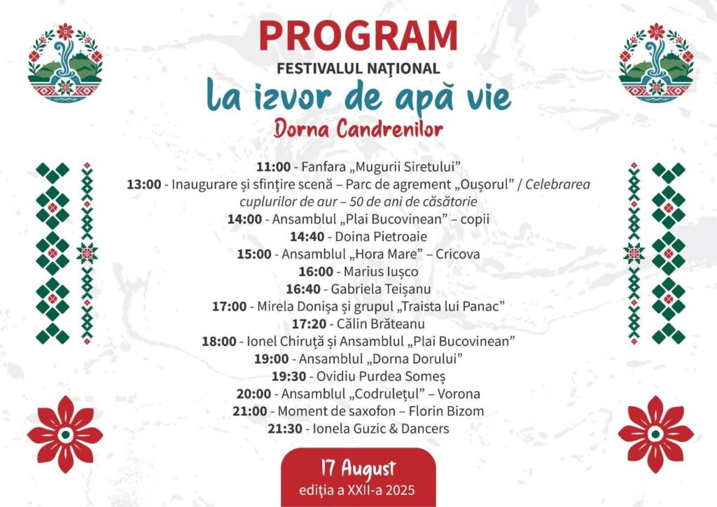 La data de 17 august 2025, comuna Dorna Candrenilor va deveni centrul muzicii, dansului și tradițiilor populare românești, odată cu desfășurarea ediției a XXII-a a Festivalului Național „La izvor de apă vie”. Evenimentul, organizat în Parcul de agrement „Oușorul”, promite o zi plină de spectacole, emoții și momente de neuitat.