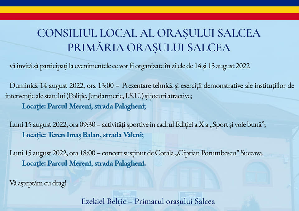 Primăria Orașului Salcea, prin edilul Ezekiel Belțic, îi invită pe cetățeni să ia parte cu toții la evenimentele ce se vor desfășura în zilele 14 și 15 august 2022.