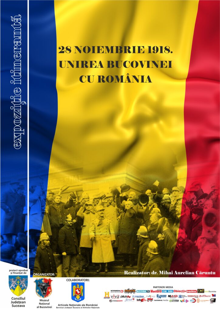 Expoziţia itinerantă ”28 Noiembrie 1918. Unirea Bucovinei cu România”, realizată la Muzeul de Istorie de dr. Mihai-Aurelian Căruntu, cuprinde 25 de panouri, care prezintă acte inedite adoptate de Consiliul Naţional Român, documentele Constituantei şi cele ale Congresului Naţional al Bucovinei, fotografiile unor personalităţi politice şi militare, sau ale unor eroi care s-au jertfit pe altarul idealului naţional, printre care: Iancu Flondor, Ioan Nistor, Sextil Puşcariu, generalul Iacob Zadik, Ion Grămadă, Lascăr Luţia, Teodor Turtureanu ş.a.