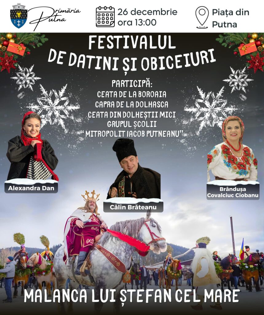 Comuna Putna va fi, din nou, în centrul tradițiilor populare bucovinene, în a doua zi de Crăciun. Pe 26 decembrie, începând cu ora 13.00, Piața din Putna va găzdui Festivalul de Datini și Obiceiuri, un eveniment devenit deja o tradiție pentru comunitatea locală și pentru numeroșii vizitatori care aleg să petreacă sărbătorile de iarnă în zonă.