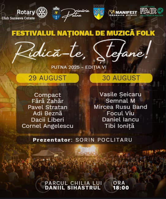 Comuna Putna se pregătește să devină, la final de august, capitala muzicii folk din România. În perioada 29–30 august 2025, se va desfășura cea de-a șasea ediție a Festivalului Național de Muzică Folk „Ridică-te, Ștefane!”, un eveniment cultural de amploare, care adună pe aceeași scenă nume sonore ale muzicii românești.