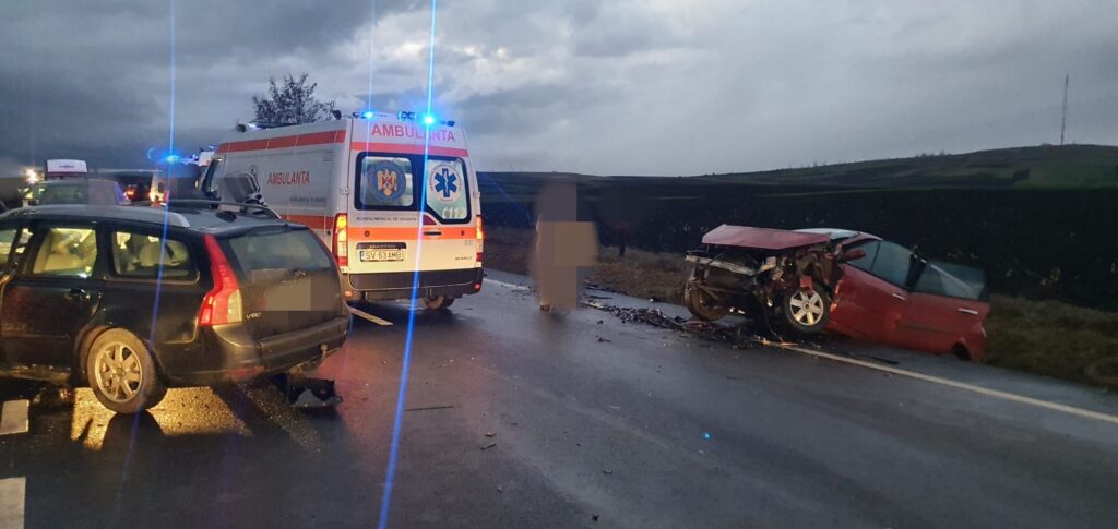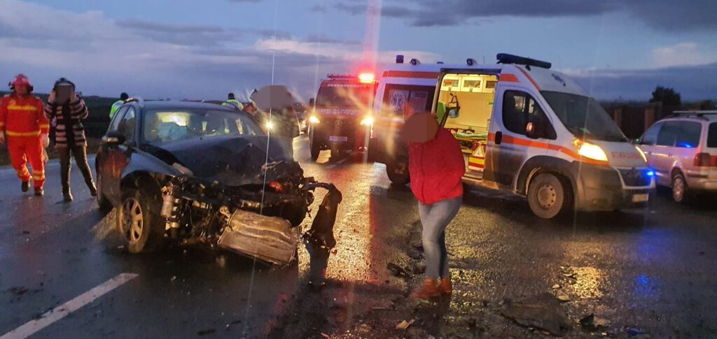 Este vorba despre un accident rutier cu trei autovehicule implicate. Patru adulți și un minor sunt preluați de către ambulanțele trimise la fața locului.