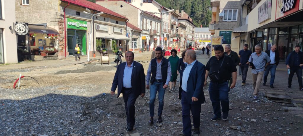 „Așa cum vă promiteam cu câteva luni în urmă, municipiul Vatra Dornei prinde contur de perlă turistică montană, iar implicarea noastră, a Consiliului Județean Suceava, de sprijinire a primăriei Vatra Dornei dă roade. În acest moment Cazinoul Băilor, modernizat de Arhiepiscopia Sucevei și Rădăuților printr-un proiect european, este aproape finalizat. CJ Suceava a fost în acești ani aproape de acest proiect, de la promovarea lui, până la finalizare și astăzi putem spune că această perla a Bucovinei, cazinoul, este salvată. Tot la Vatra Dornei străzile și trotuarele din jurul cazinoului sunt pavate cu piatră specială. A fost finalizat podul splendid peste râul Dorna, iar în albia râului se betonează un canal în amonte și în aval de pod, care va da un aspect liniștit, odihnitor, apei râului Dorna, în inima stațiunii turistice. Strada care leagă Primăria de Cazino, strada Luceafărului, este deja pavată cu piatră cubică aproape pe jumătate. Aici au avut loc ample lucrări subterane de schimbare a conductelor de apă, canalizare, aducerea gazului metan precum și îngroparea cablurilor în canale tehnice. Bulevardul principal din fața primăriei, bulevardul Mihai Eminescu, prinde și el contur. Trotuarele sunt terminate, primul strat se asfalt este turnat, se lucrează la ridicarea capacelor de canalizare și imediat va fi turnat și cel de al doilea strat de asfalt. Implicarea noastră, a CJ Suceava, și implicarea primăriei au fost permanente de la aprovizionarea cu piatră pentru trotuar până la pregătirea iluminatului stradal. Am cuvinte de apreciere față de constructorii care au lucrat până seara târziu, inclusiv sâmbătă. Din cei 30 de kilometri de conducere de gaz metan, doar un kilometru de conductă mai este de îngropat. Testul rețelei este finalizat, iar constructorul garantează că până în decembrie vor putea da drumul la gaz în Vatra Dornei. Sunt convins că până la sfârșitul acestui an orașul Dorna se va schimba la față. În ultimul timp orașul a fost un adevărat șantier, lucru care a creat disconfort pentru populație, care însă va începe acum să aibă parte și de beneficii. Cuvinte de apreciere am și pentru Primăria Dorna. Echipa primarului, împreună cu viceprimarul, au fost neobosiți pe toate șantierele din oraș. Acesta este doar un exemplu a legăturii strânse dintre CJ Suceava și primării, unde gândirea de echipă, pe care o încurajăm cu fiecare dintre localitățile județului Suceava, a început deja să dea roade”, a transmis Gheorghe Flutur.