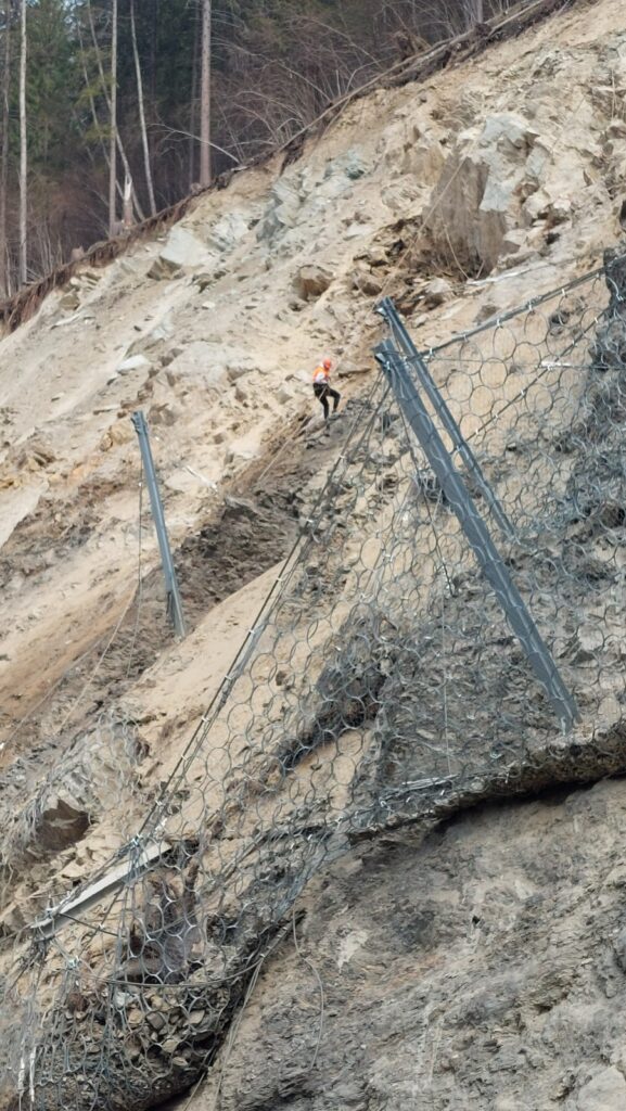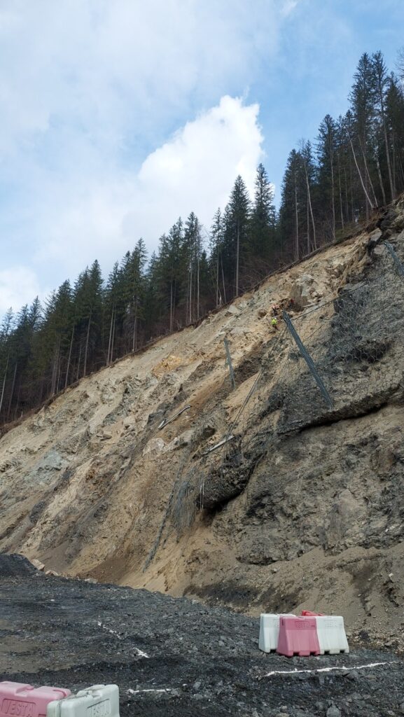 De luni, lucrările de stabilizare a versantului au debutat cu o nouă sesiune de derocare și de îndepărtare a pietrelor acumulate în șanțul de colectare executat în decembrie anul trecut, iar până la finalul acestei săptămâni se dorește să fie instalate plasele pentru reținerea rocilor. Montarea acestor plase vor permite începerea lucrărilor de forare și turnare a celor 135 de piloni care sunt fundația viitorului zid de protecție și sprijin, în lungime de 115 metri și 5 – 6 metri înălțime. Pilonii vor avea un diametru de 1 metru și vor fi turnați în puțuri forate cu adâncimi cuprinse între 8 și 10 m.