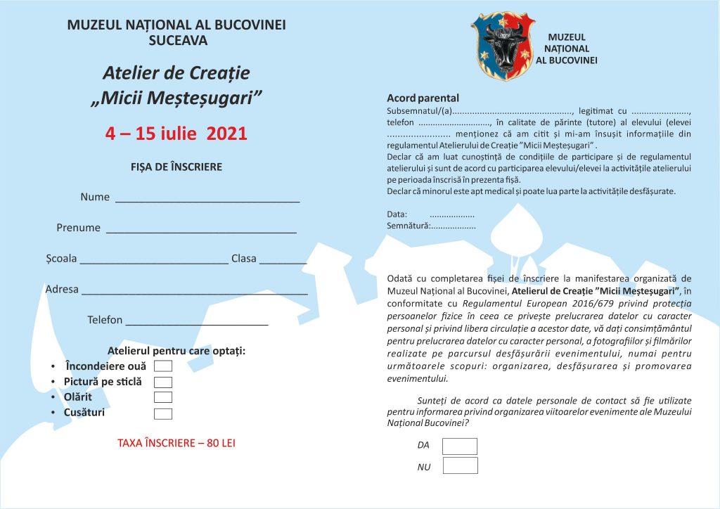 Muzeul Național al Bucovinei invitã copiii pasionați de arta populară, să participe la Atelierul de creație MICII MEŞTEŞUGARI, ediţia a XXV-a.