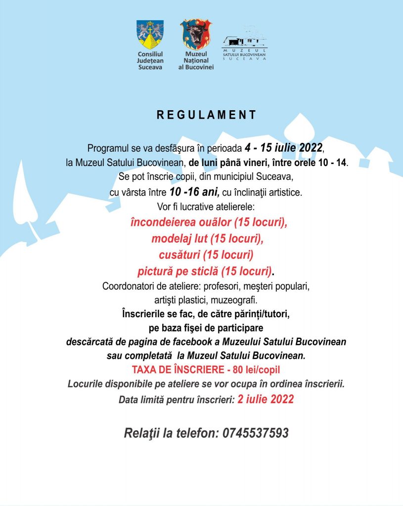 Programul se desfășoară în perioada 4 – 15 iulie 2022, la Muzeul Satului Bucovinean, de luni până vineri, între orele 10 – 14.