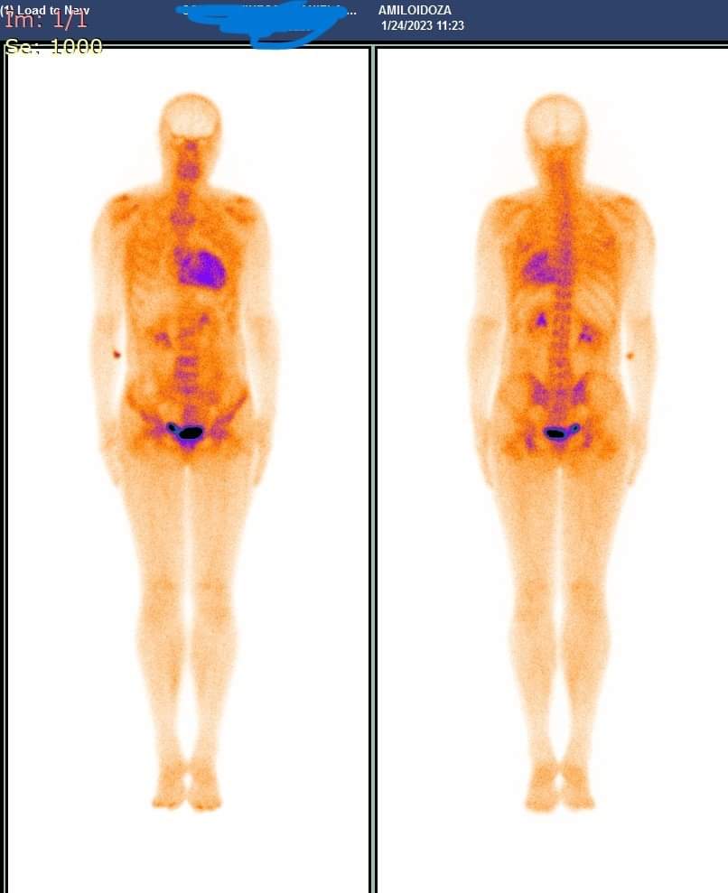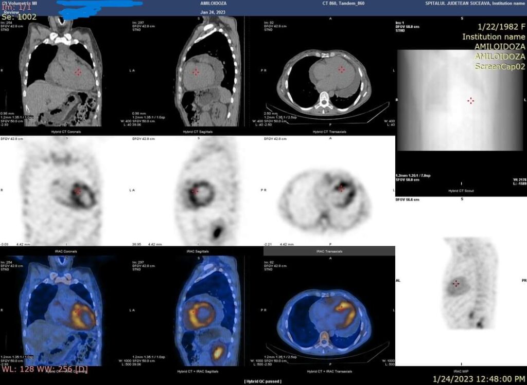 Recent, în Laboratorul de Medicină Nucleară al SJUSV în cadrul Centrului de diagnosticare și tratament al Amiloidozei coordonat de doctorul Daniela Neagu, medic primar neurolog, împreună cu doctorul Ramona Rusu, medic primar cardiolog, a fost investigat un caz de amiloidoză ereditară prin scintigrafie cu Tc99m-difosfonat. Fixarea radiofarmaceuticului în aria de proiecție cardiacă (scintigrafia corp întreg) similară fixării costale sau peste fixarea costală este diagnosticată pentru acest tip de patologie. Pentru reducerea rezultatelor scintigrafice fals pozitive, se poate efectua suplimentar achiziție SPECT/CT. Astfel se diferențiază dacă fixarea este la nivel miocardic, circulant sau extracardiac.