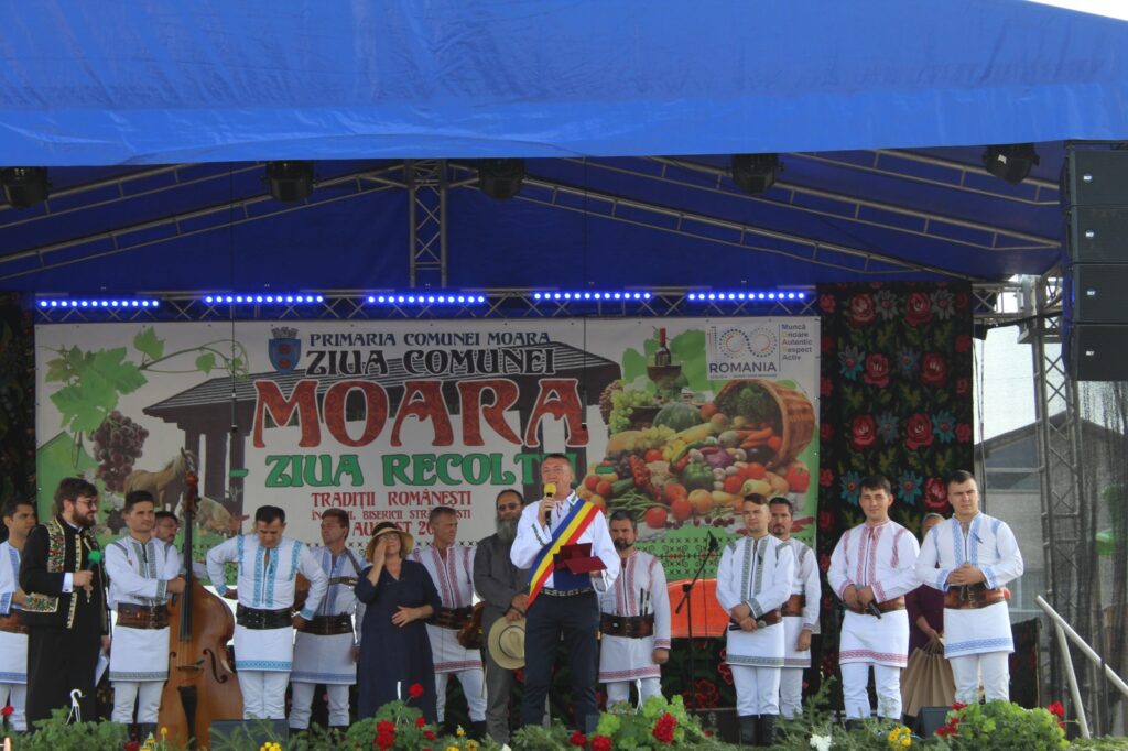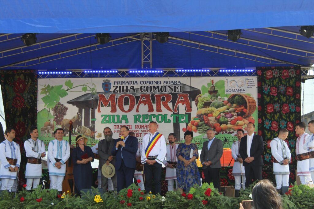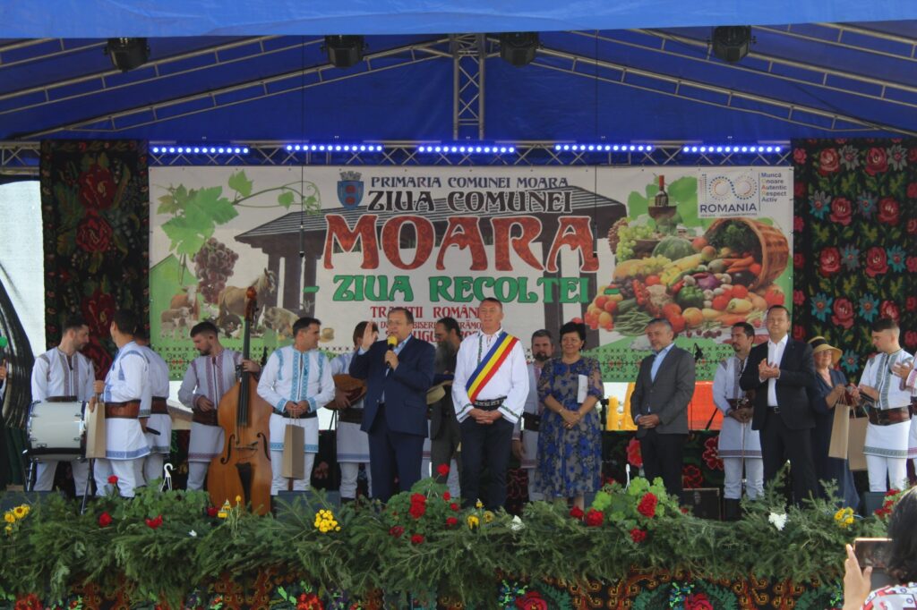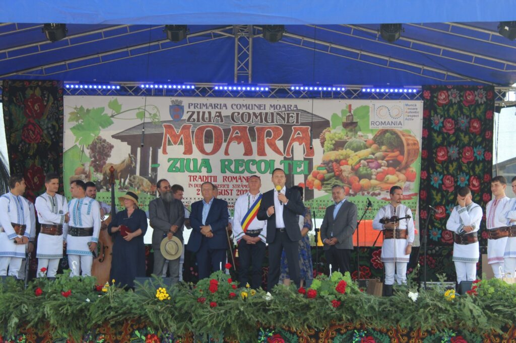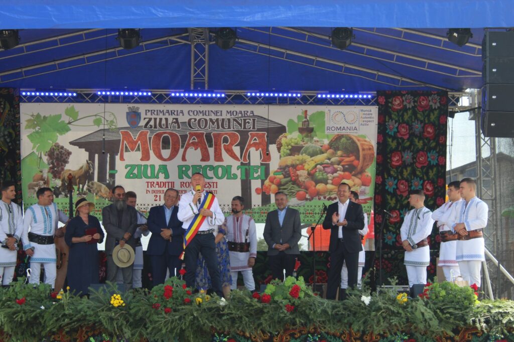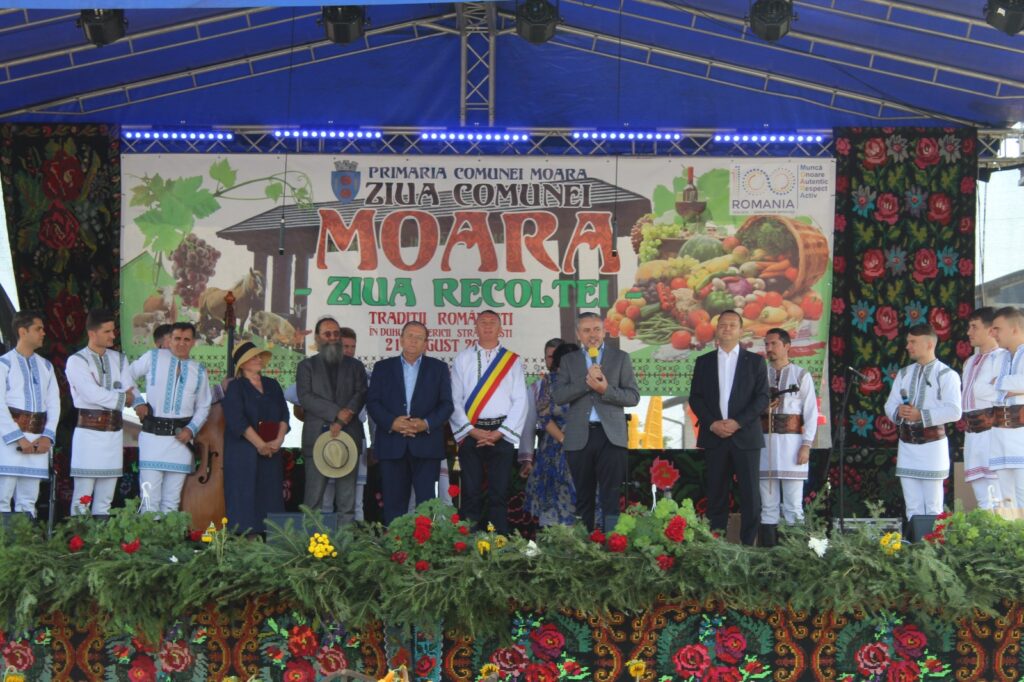 „Ziua bună oameni buni, nu știu, să vorbesc, să cânt, să strig, dar felicitări Moara pentru organizarea acestui eveniment. M-a întrebat cineva adineauri, cum mă simt aici, am fost, am vechime la dumneavoastră. În primul rând, s-a sfințit o troiță ortodoxă construită la comanda unui primar care este de altă religie decât ortodoxă, asta înseamnă toleranță, înțelepciune, creștinismul este împreună, Dumnezeu este unul singur. Felicitări domnule primar, felicitări comunității de ortodocși și de catolici și ceilalți, asta-i Bucovina, toleranță, asta înseamnă mult. În al doilea rând, aveți ce sărbători. Când intri în comună, e la concurență cu orașul Suceava, arată ca o comună europeană. Am început demult și îmi aduc aminte cu drag de domnul fost primar Prodaniuc, pe care îl salut. Mă leagă multe investiții de dumneavoastră, cum mă leagă și de domnul primar, care s-a alăturat în echipa mea și care se zbate și ți-e mai mare dragul să-l ajuți, să-i dai fonduri să facă ceva, pentru că, vedeți dumneavoastră, uneori și pe mine mă întreabă, lumea, domnule Flutur, duminică dansai pe toloacă, dar de luni, drumul. Și probabil și dumneavoastră aveți aceeași întrebare, drumul spre Liteni – Moara. Îmi pare rău, n-a fost vina noastră, un constructor a abandonat o lucrare, prețurile s-au schimbat, mă lupt să aducem alți constructori cât de repede, numai că sunt niște reguli, eu nu le pot trece, însă în județul Suceava avem foarte multe investiții și vă rog, de mâine să vedeți pe televizor și în mass-media, noi surprize bune pentru județul Suceava, fie că vorbim de spital, fie că vorbim de investiții mari în infrastructură. Mă bucur că recunoașteți aici ce fac oamenii de artă, acest tezaur uman viu, cu familia Zidaru care au acea fermă de artă de la Liteni și sincer îi felicit. Și eu mă lupt să facem un muzeu pentru județul Suceava. Dumneavoastră aveți aici, un boț de aur, în comuna Moara și vă felicit că i-ați făcut cetățeni de onoare pentru că sunt cetățeni de onoare ai întregii Bucovine. În rest, domnule primar, vă felicit pentru fermieri, pentru produse, vedeți dumneavoastră, numai să ne plângem, că-i greu, că nu plouă, nu merge. Aici, oamenii și dacă nu plouă, au scos pe tarabe. Au scos mure, alte produse făcute aici, asta înseamnă mâna de gospodari. N-ai cum să nu te alături acestor oameni și vreau să contați pe mine în continuare pentru că iubesc oamenii gospodari cu bătături în palmă, iubesc oamenii care vin și țin la Bucovina și o promovează în port popular, iubesc Bucovina asta dragă pentru că avem toate motivele să fim mândri că trăim aici. Doamne ajută, bun-venit Plăieșii, prietenii mei din Basarabia, aici în Bucovina, sunt niște oameni excepționali și poate o să-i facem cumva să-i aducem și mai des, să prindă drag de Bucovina și mai mult, pentru că și ei ne trezesc la viață prin ceea ce fac. Doamne ajută și gândul cel bun!”, a declarat la Moara, președintele Consiliului Județean, Gheorghe Flutur.