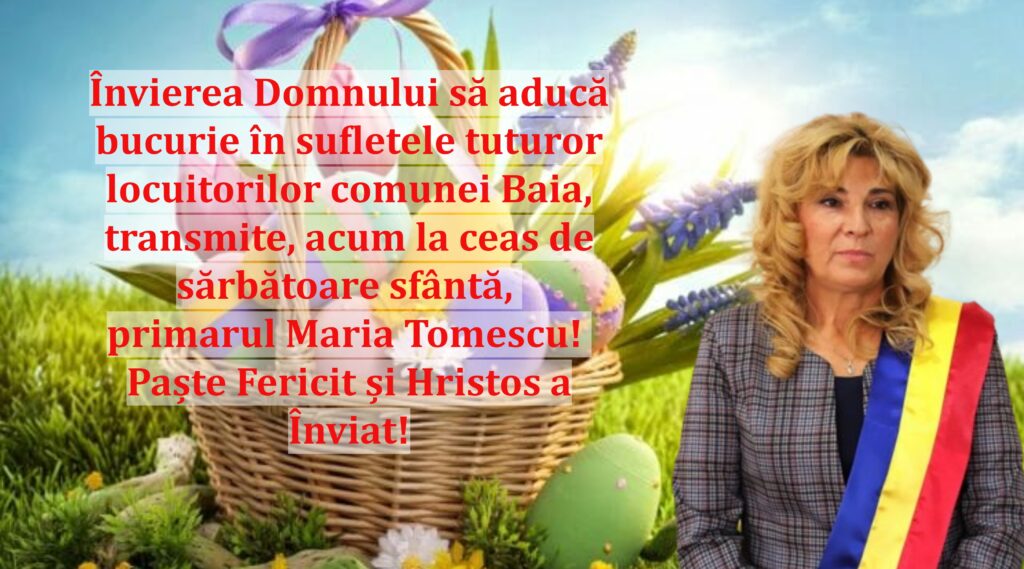Învierea Domnului să aducă bucurie în sufletele tuturor locuitorilor comunei Baia, transmite, acum la ceas de sărbătoare sfântă, primarul Maria Tomescu! Paște Fericit și Hristos a Înviat!
