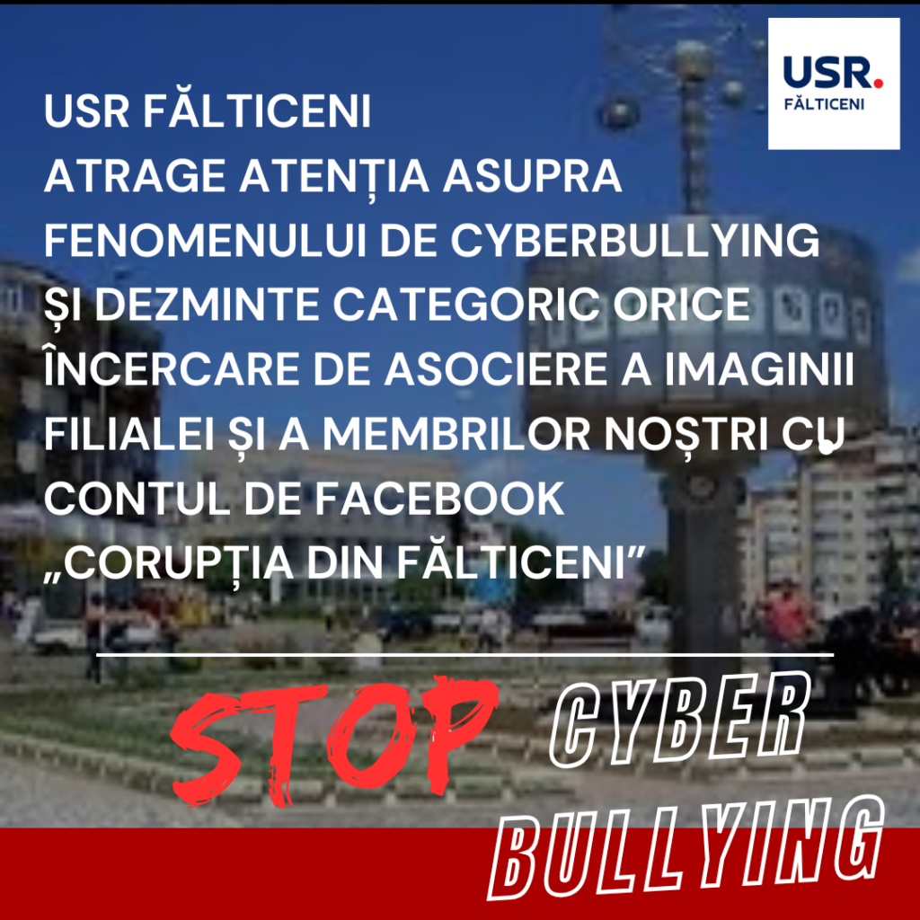 USR Fălticeni atrage atenția asupra fenomenului de cyberbullying și dezinformare și dezminte categoric orice încercare de asociere a imaginii filialei și a membrilor noștri cu contul de Facebook „Corupția din Fălticeni”, care publică mesaje critice la adresa primarului PSD.