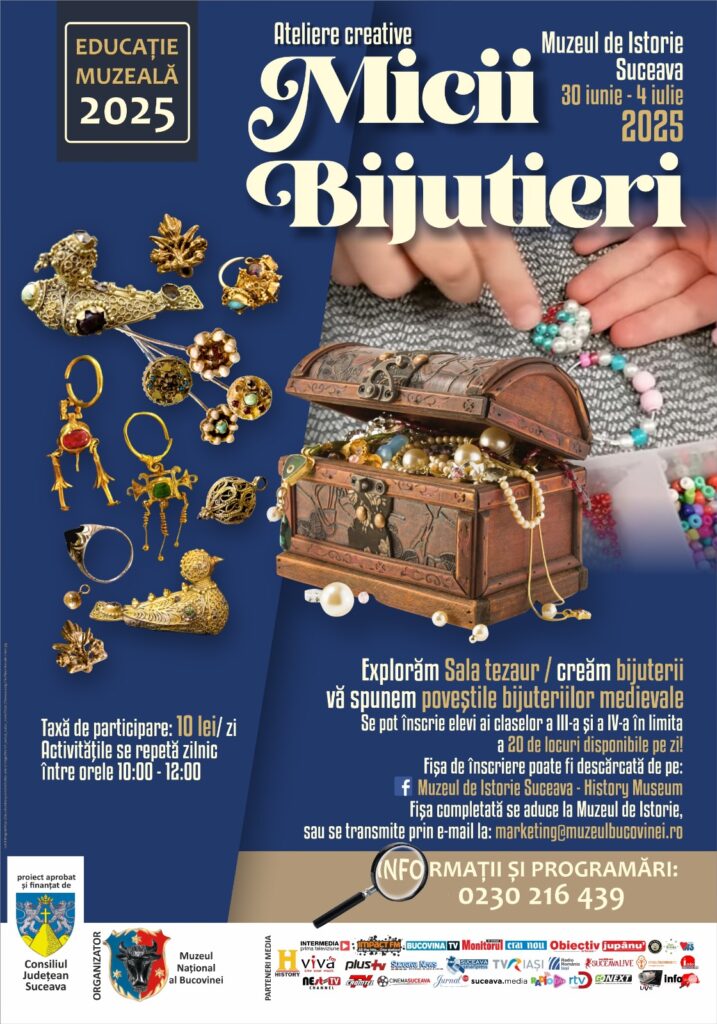 Muzeul Național al Bucovinei continuă seria proiectelor educaționale cu atelierele de vară, invitând elevii din clasele a III-a și a IV-a să cunoască lumea fascinantă a bijuteriilor medievale, provocându-i să devină, pentru o zi, mici bijutieri.