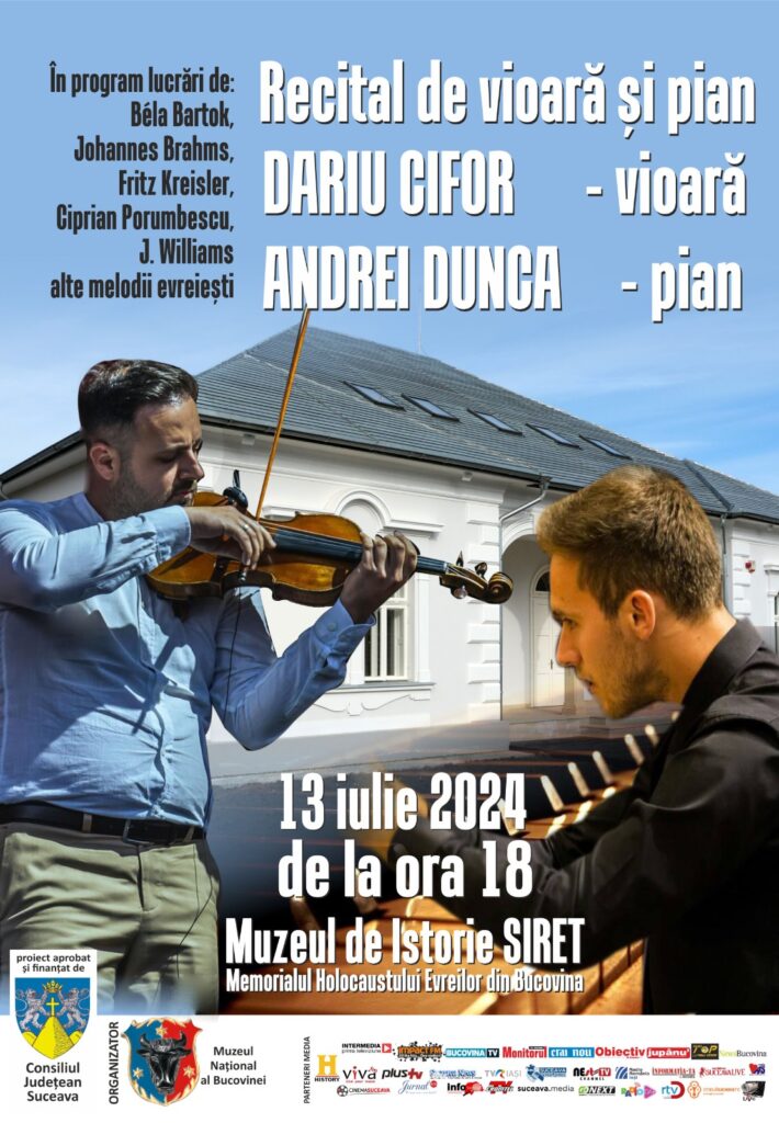 Muzeul Național al Bucovinei vă invită sâmbătă, 13 iulie 2024, ora 18, la Muzeul de Istorie Siret, la un Recital de vioară și pian, susținut de soliștii DARIU CIFOR  – vioară și ANDREI DUNCA – pian.