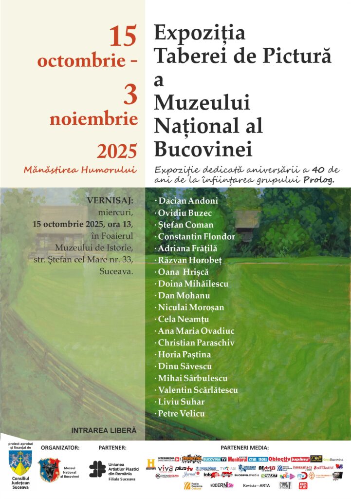 Muzeul Național al Bucovinei vă invită la vernisajul expoziției „Tabăra de pictură de la Mănăstirea Humorului – 2025”, care va avea loc miercuri, 15 octombrie 2025, ora 13, în Foaierul Muzeului de Istorie, Str. Ștefan cel Mare nr. 33, Suceava.