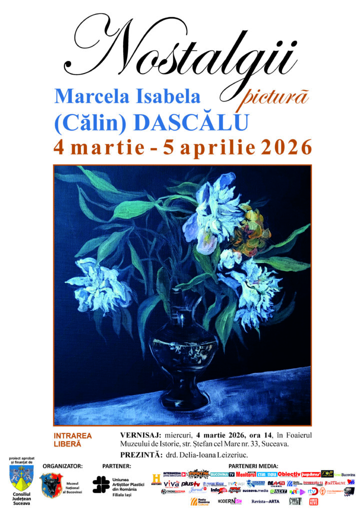 Muzeul Național al Bucovinei invită publicul la vernisajul expoziției Nostalgii, semnată de artista Marcela Isabela (Călin) Dascălu. Evenimentul va avea loc miercuri, 4 martie 2026, ora 14.00, în Foaierul Muzeul de Istorie din Suceava (str. Ștefan cel Mare nr. 33).