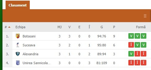 | 9. | CS Dante Botoşani | 5 | 1 | 0 | 4 | 4-11 | -7 | 3 |