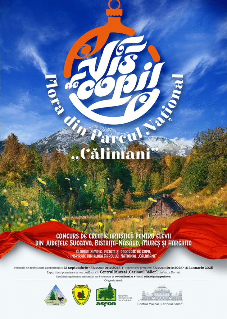 Regia Națională a Pădurilor – ROMSILVA – Administrația Parcului Național Călimani R.A., Asociația Forestierilor din România – ASFOR și Centrul Muzeal Cazinoul Băilor Vatra Dornei anunță lansarea concursului de creație artistică „Vis de copil – Flora din Parcul Național Călimani”, adresat elevilor din unitățile școlare din județele Suceava (comuna Dorna Candrenilor, comuna Poiana Stampei, comuna Panaci, comuna Șaru Dornei, comuna Dorna Arini, municipiul Vatra Dornei), Bistrița-Năsăud (comuna Bistrița Bârgăului), Harghita (comuna Bilbor) și Mureș (comuna Lunca Bradului, comuna Răstolița, comuna Stânceni).