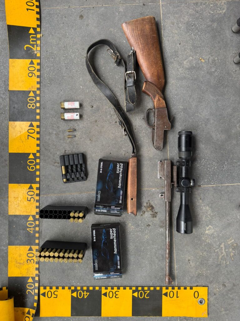Perchezițiile derulate în Sadova, la imobilele folosite de suspectul Ioan Săduțu, au dus la descoperirea unei arme letale de vânătoare fără serie sau număr, prevăzută cu lunetă, încărcată cu un cartuș pe țeavă, precum și a altor cartușe neînregistrate în permisul de port-armă. De asemenea, polițiștii au ridicat 27 de cartușe de calibru 30.06, deținute legal, dar aflate în proximitatea muniției neconforme.