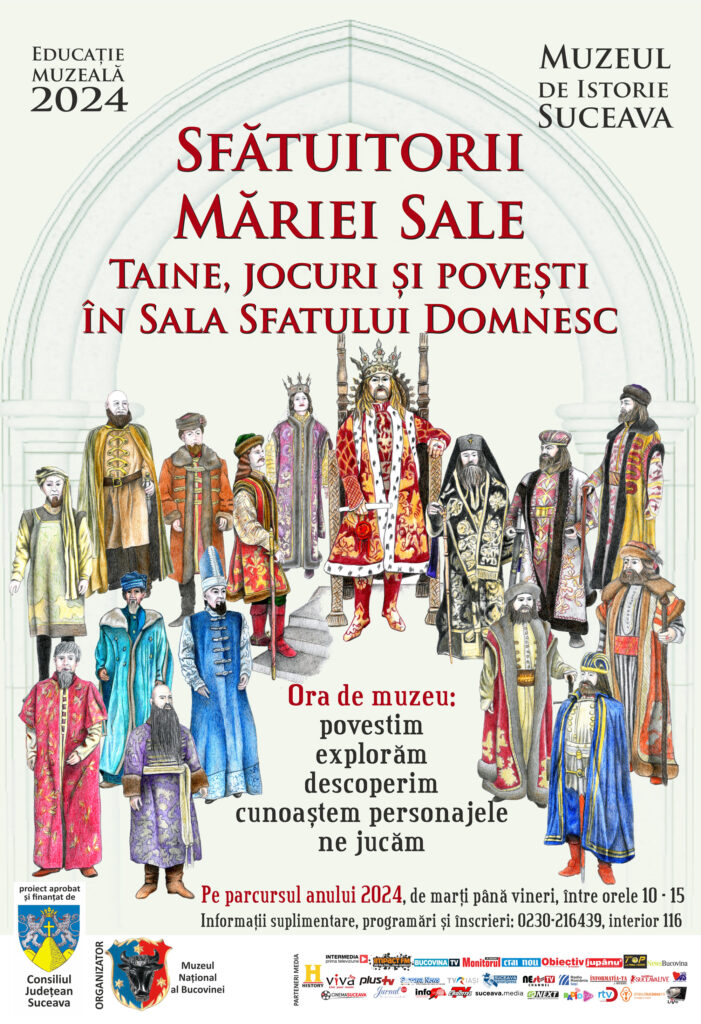 Așadar, invităm, pe tot parcursul anului 2024, copiii și tinerii să se joace cu istoria, să petreacă ore de muzeu de poveste, în care publicul este invitat să afle povestea Sfatului Domnesc de la Suceava și a sfătuitorilor Măriei Sale, cu ajutorul poveștilor ilustrate, a jocurilor, a prezentărilor inedite.