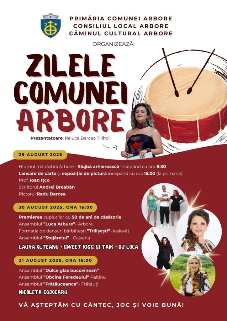 „Zilele Comunei Arbore sunt, înainte de toate, sărbătoarea oamenilor noștri. Este momentul în care îi onorăm pe cei care au clădit această comunitate și în care ne bucurăm împreună de tradițiile noastre. Am pregătit un program divers, care să aducă pe scenă atât folclorul autentic al Bucovinei, cât și artiști iubiți de public. Invităm toți localnicii și pe cei din comunele învecinate să ni se alăture, pentru a trăi trei zile de cântec, joc și voie bună”, a declarat primarul Dan Tiperciuc.