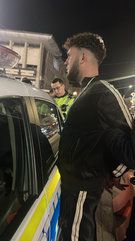 Celălalt șofer implicat, Tudor B., a declarat că, în timp ce se afla la semaforul din zona benzinăriei Lukoil, autoturismul Dacia din fața sa a rulat înapoi și i-a lovit mașina. În timpul discuțiilor ulterioare, acesta a observat că șoferul era în stare de ebrietate, motiv pentru care l-a urmărit până la restaurantul Latino, unde tânărul a abandonat mașina și a fugit pe jos.