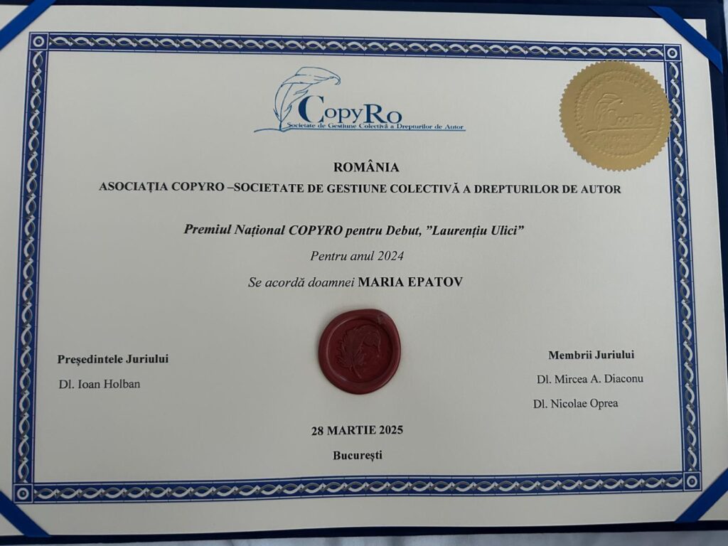 Universitatea noastră a fost reprezentată de dna Maria Epatov, cadru didactic asociat, care a primit premiul pentru debut în critica literară, pentru volumul Scriitori armeni din România. Literatură și identitate, apărut în anul 2024, la Editura Muzeul Național al Literaturii Române, volum ce reprezintă rezultatul cercetărilor din perioada doctoratului, sub îndrumarea profesorului univ. dr. Mircea A. Diaconu, prorector al Universității „Ștefan cel Mare” din Suceava.