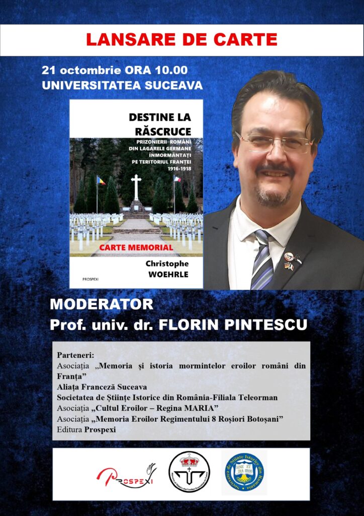 Ieri, 21 octombrie, Facultatea de Istorie, Geografie și Științe Sociale (FIGSS) din cadrul Universității „Ștefan cel Mare” Suceava a găzduit lansarea volumului „Destine la Răscruce. Prizonierii români din lagărele germane înmormântați pe teritoriul Franței 1916–1918”, semnat de istoricul francez Christophe Woehrle, originar din Alsacia.