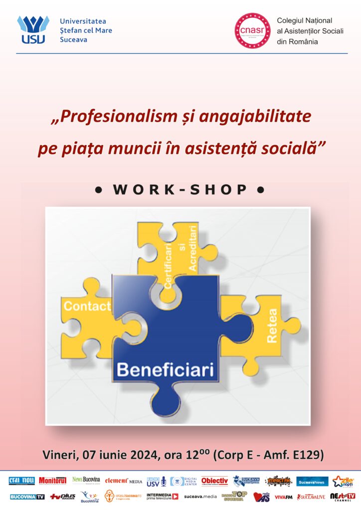 Departamentul de Științe Umane și Social-Politice (programul de studiu Asistență socială) din cadrul Facultății de Istorie și Geografie, Universitatea „Ștefan cel Mare” din Suceava, și Colegiul Național al Asistenților Sociali, Sucursala Teritorială Suceava, organizează, în data de 7 iunie a.c., începând cu ora 12.00, în Amf. E129 (corp E), workshopul intitulat Profesionalism și angajabilitate pe piața muncii în asistență socială. La eveniment sunt invitați reprezentanți ai unor instituții și organizații de asistență socială, care vor evidenția, prin prezentări, discuții și dezbateri, perspectivele de angajare în acest domeniu.