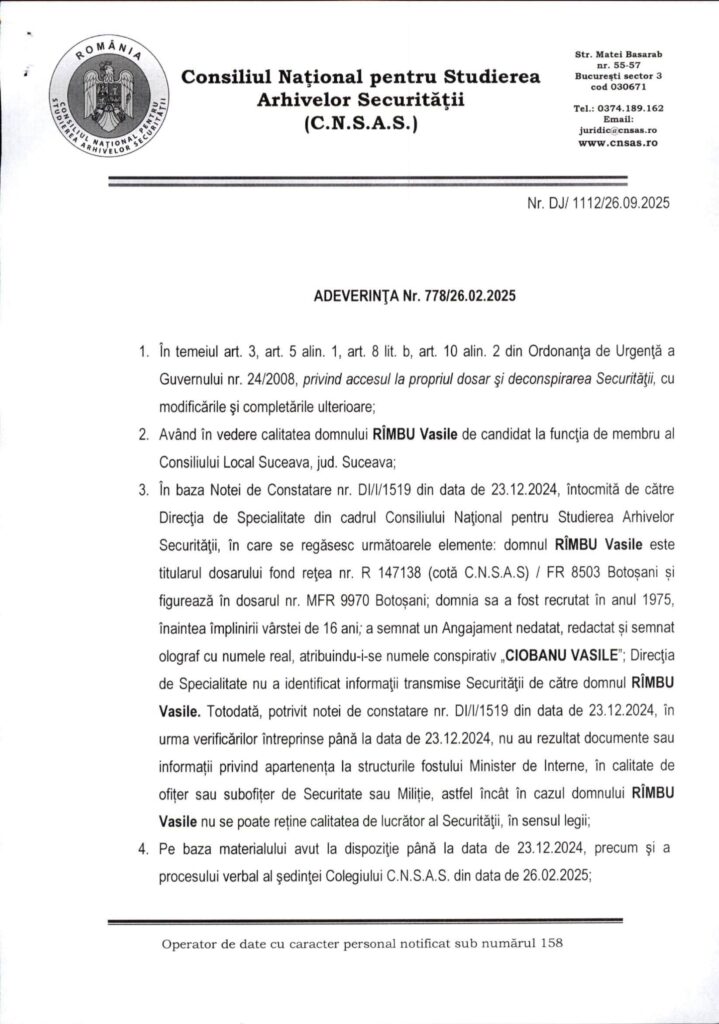 Consiliul Național pentru Studierea Arhivelor Securității (CNSAS) a publicat primele concluzii ale verificărilor privind trecutul primarului municipiului Suceava, Vasile Rîmbu. Documentele din arhive arată că acesta a semnat, în anul 1975, un angajament de colaborare cu fosta Securitate, sub numele conspirativ „Ciobanu Vasile”.