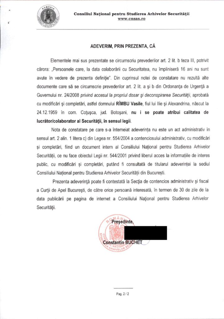 Astfel, instituția nu i-a atribuit lui Vasile Rîmbu calitatea oficială de colaborator al Securității, iar cazul se oprește la nivelul constatării semnării unui angajament fără urmări juridice.