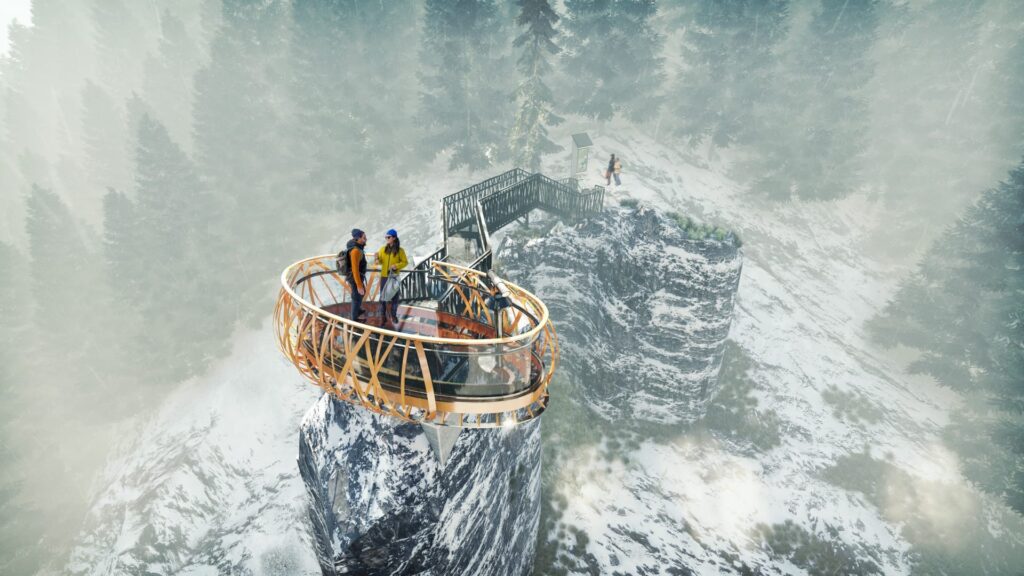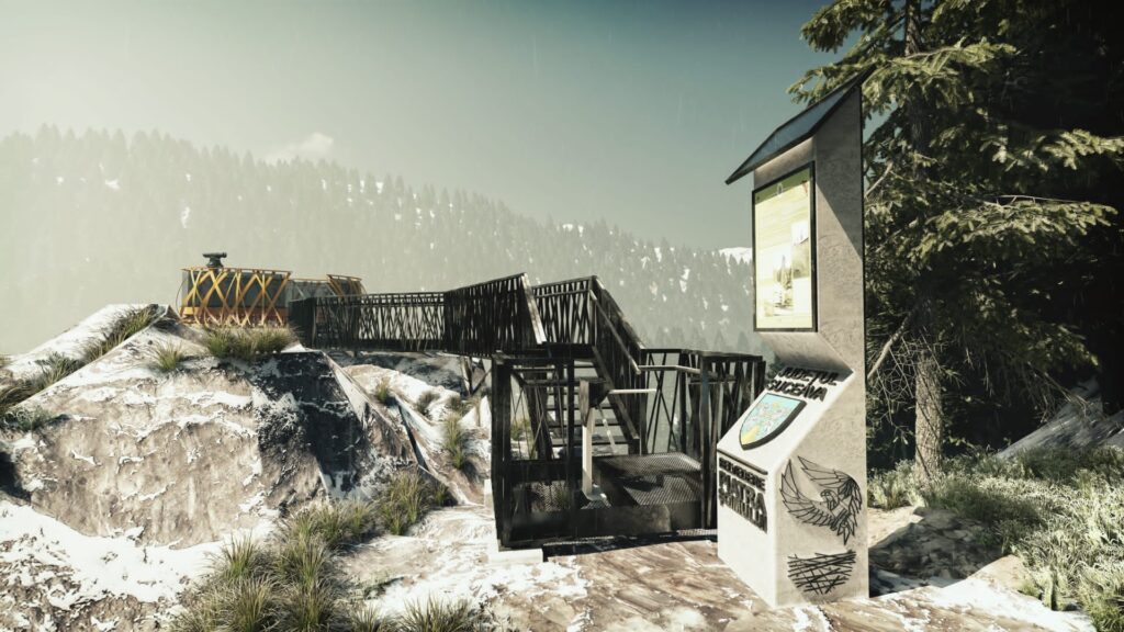 – o platformă de observație ce reprezintă punctul principal al amenajării, realizată elipsoidal, cu pardoseală de sticlă ce permite observarea completă a peisajului, cu balustradă din sticlă dublată parțial de una realizată din elemente metalice montate pentru a imita împletitura cuibului de șoim.
