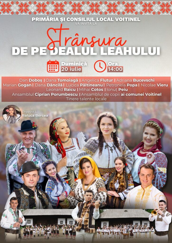 Comuna Voitinel se pregătește de sărbătoare. Duminică, 20 iulie, începând cu ora 14.00, pe Dealul Leahului va avea loc evenimentul folcloric „Strânsura de pe Dealul Leahului”, o manifestare cultural-artistică ce promite să adune comunitatea locală în jurul valorilor autentice românești. Organizatorii – Primăria și Consiliul Local Voitinel – au pregătit un spectacol de excepție, cu artiști consacrați, ansambluri folclorice și tineri talentați din zonă.